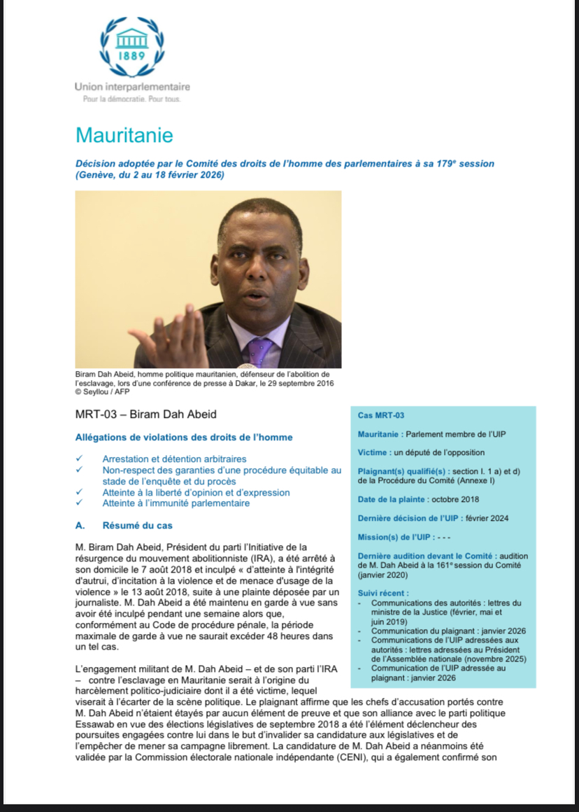 أعرب الاتحاد البرلماني الدولي عن قلقه مما وصفه بانتهاكات يتعرض لها النائب الموريتاني المعارض بيرام الداه اعبيد، وذلك في قرار صادر عن لجنة حقوق الإنسان للبرلمانيين التابعة له.